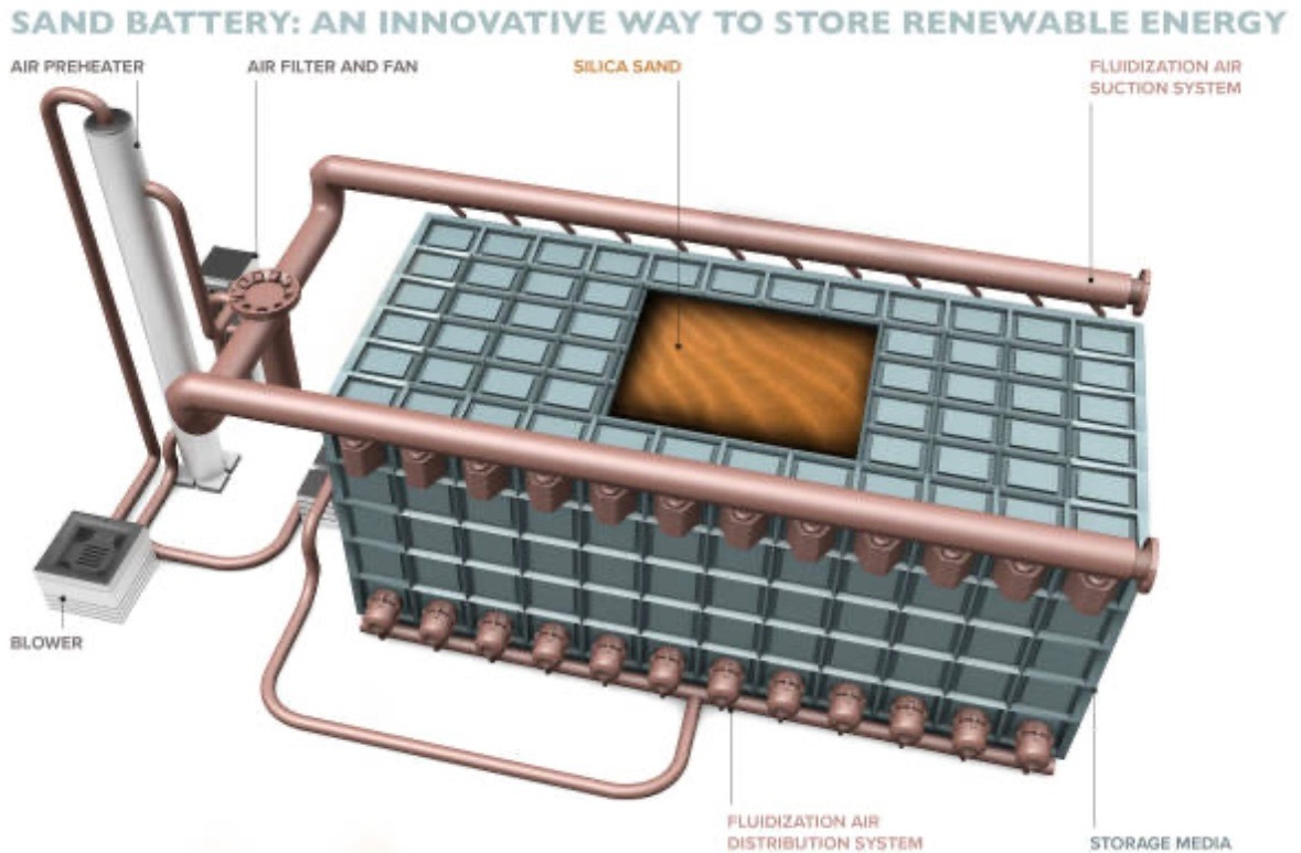 the electricity from solar panels powers mining directly by day, and the sand battery takes over at night.